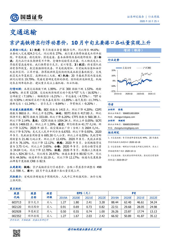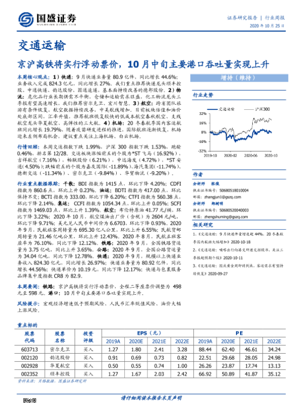 【国盛证券】【20201025】交通运输行业周报:京沪高铁将实行浮动票价,10月中旬主要港口吞吐量实现上升-22页