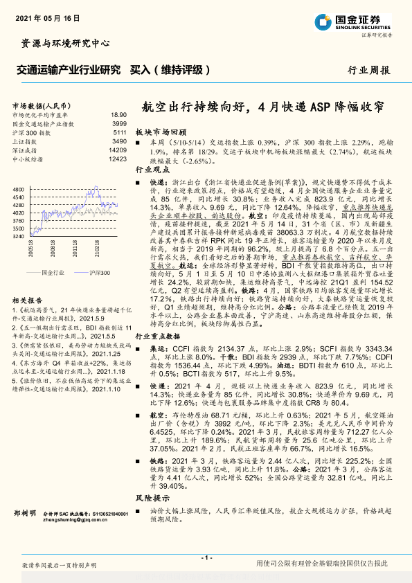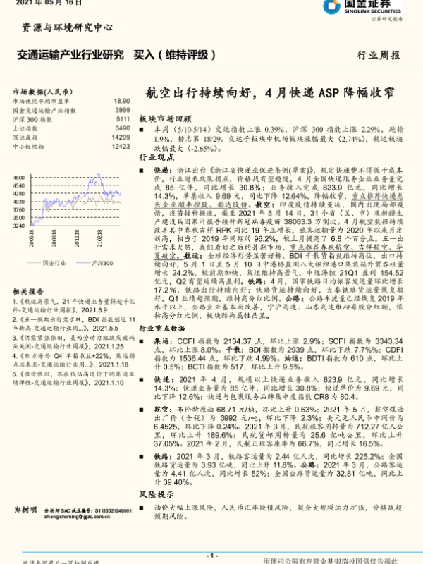 【国金证券】【20210516】交通运输产业行业研究:航空出行持续向好,4月快递ASP降幅收窄-14页