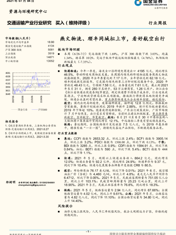 【国金证券】【20210704】交通运输产业行业研究:燕文物流、顺丰同城拟上市,看好航空出行-14页