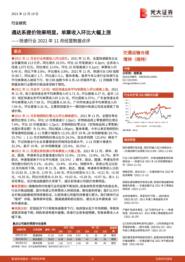 【光大证券】【20211219】快递行业2021年11月经营数据点评:通达系提价效果明显,单票收入环比大幅上涨-6页