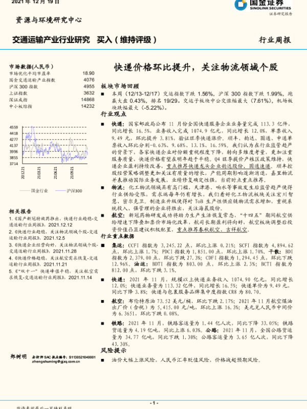 【国金证券】【20211219】交通运输产业行业研究:快递价格环比提升,关注物流领域个股-14页