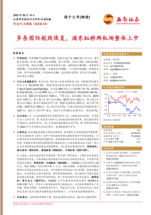 【西南证券】【20220814】交运行业周报:多条国际航线恢复,浦东虹桥两机场整体上市-20页