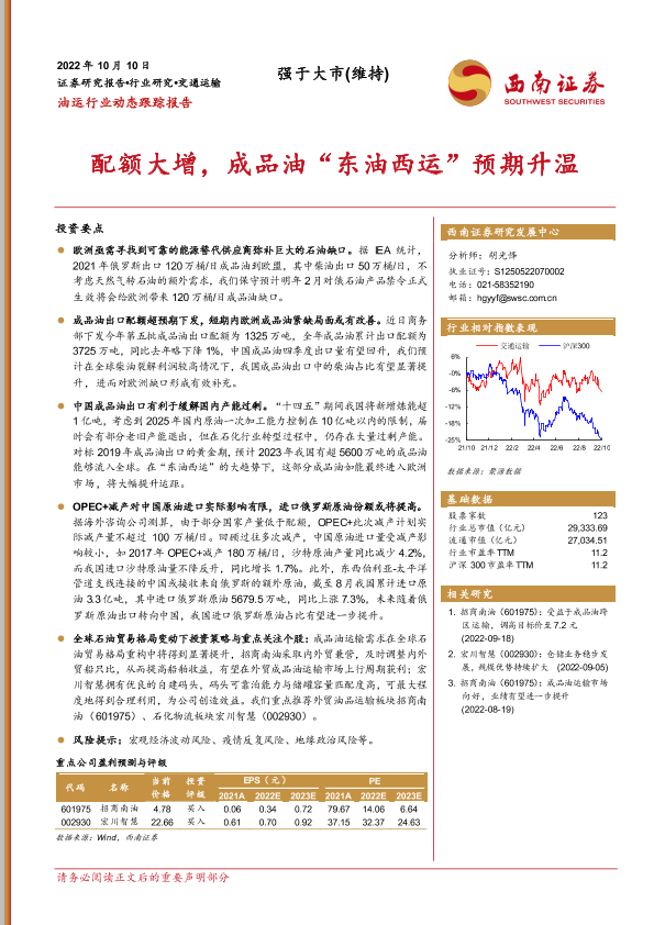 【西南证券】【20221010】油运行业动态跟踪报告:配额大增,成品油“东油西运”预期升温-15页