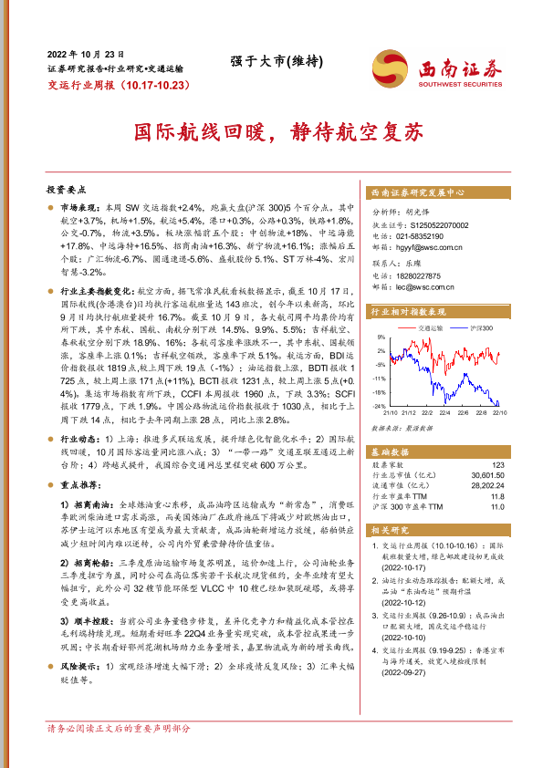 【西南证券】【20221023】交运行业周报:国际航线回暖,静待航空复苏-19页