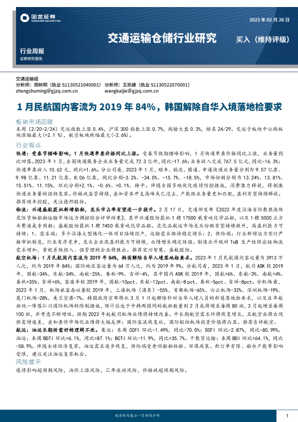 【国金证券】【20230226】交通运输仓储行业研究:1月民航国内客流为2019年84%,韩国解除自华入境落地检要求-14页
