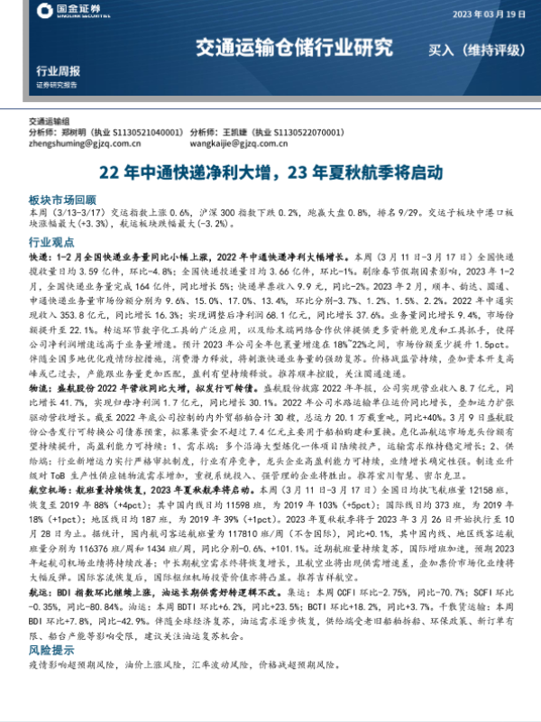 【国金证券】【20230319】交通运输仓储行业研究:22年中通快递净利大增,23年夏秋航季将启动-14页