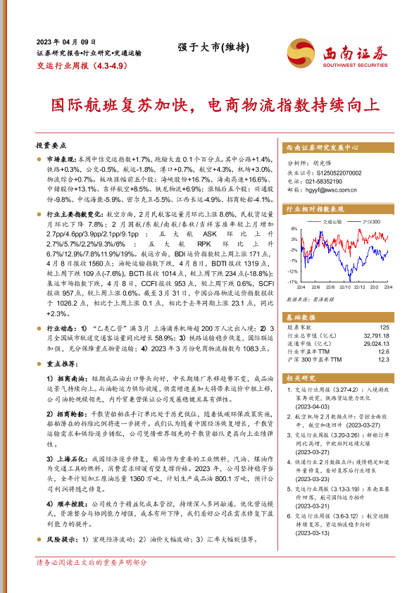 【西南证券】【20230409】交运行业周报:国际航班复苏加快,电商物流指数持续向上-20页