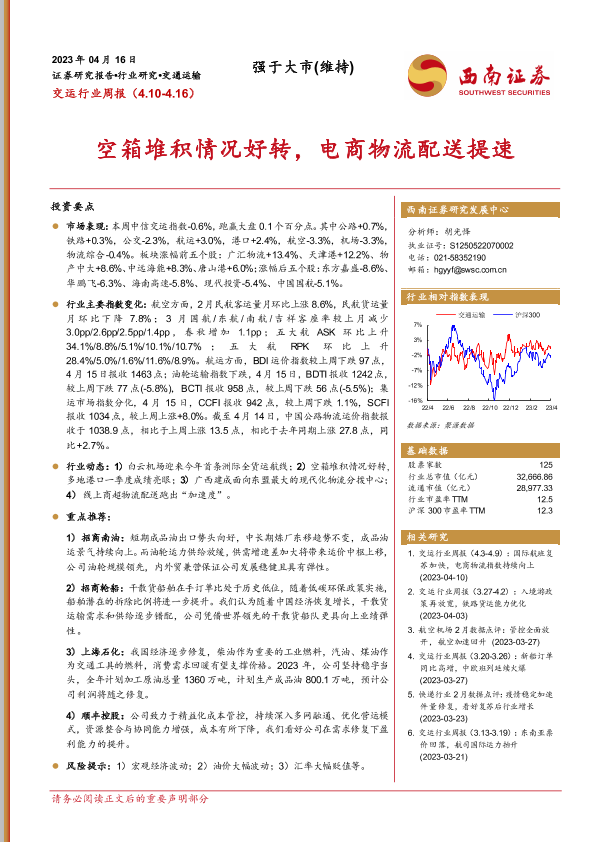 【西南证券】【20230416】交运行业周报:空箱堆积情况好转,电商物流配送提速-20页