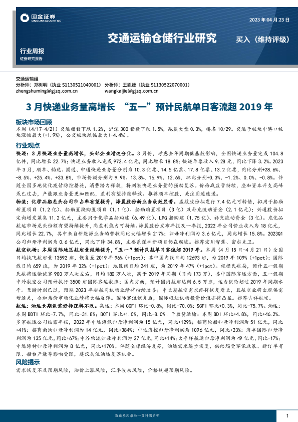 【国金证券】【20230423】交通运输仓储行业研究:3月快递业务量高增长 “五一”预计民航单日客流超2019年-14页
