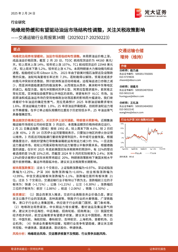 【光大证券】【20250224】交通运输行业周报第34期:地缘局势缓和有望驱动油运市场结构性调整,关注关税政策影响-15页