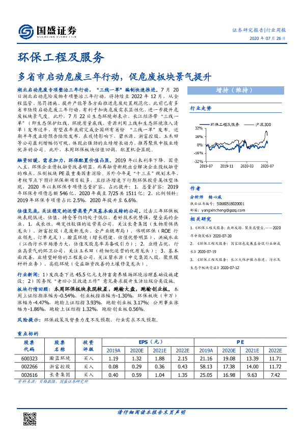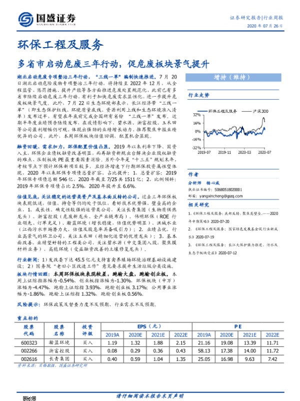 【国盛证券】【20200726】环保工程及服务行业周报:多省市启动危废三年行动,促危废板块景气提升-14页