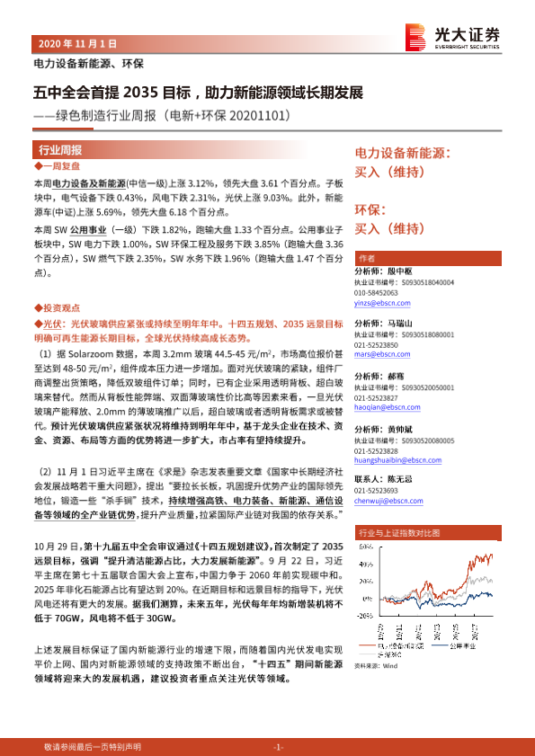 【光大证券】【20201101】绿色制造行业周报:五中全会首提2035目标,助力新能源领域长期发展-37页