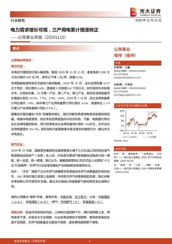【光大证券】【20201115】公用事业周报:电力需求增长可观,三产用电累计增速转正-9页