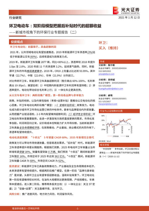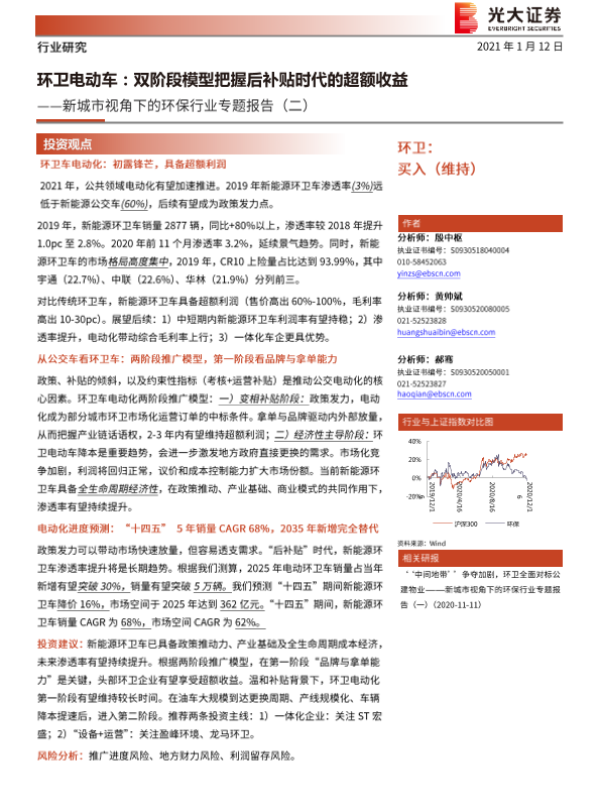 【光大证券】【20210112】新城市视角下的环保行业专题报告(二):环卫电动车:双阶段模型把握后补贴时代的超额收益-30页