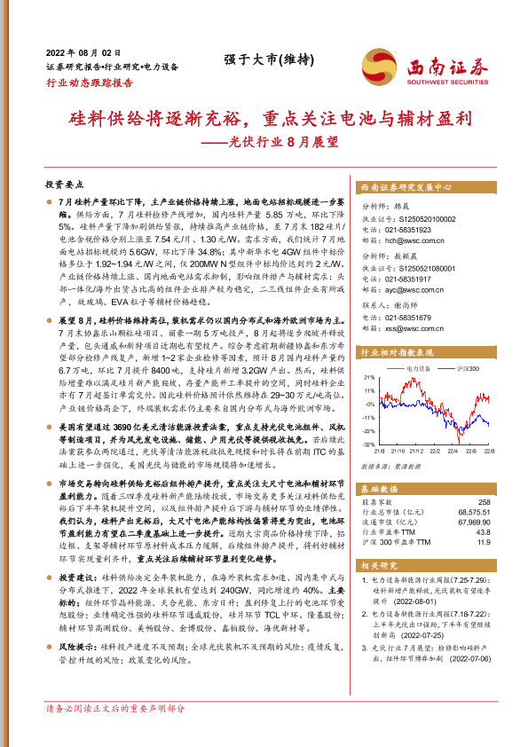 【西南证券】【20220802】光伏行业8月展望:硅料供给将逐渐充裕,重点关注电池与辅材盈利-12页