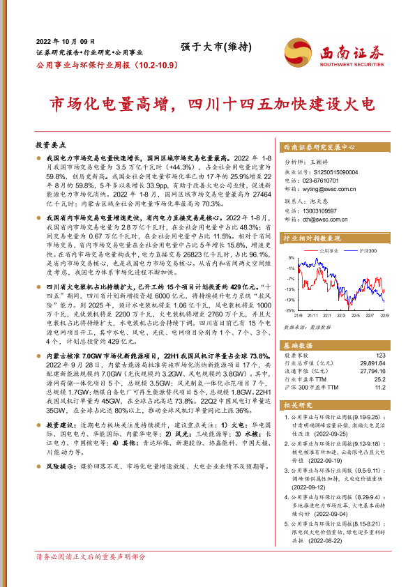 【西南证券】【20221009】公用事业与环保行业周报:市场化电量高增,四川十四五加快建设火电-27页