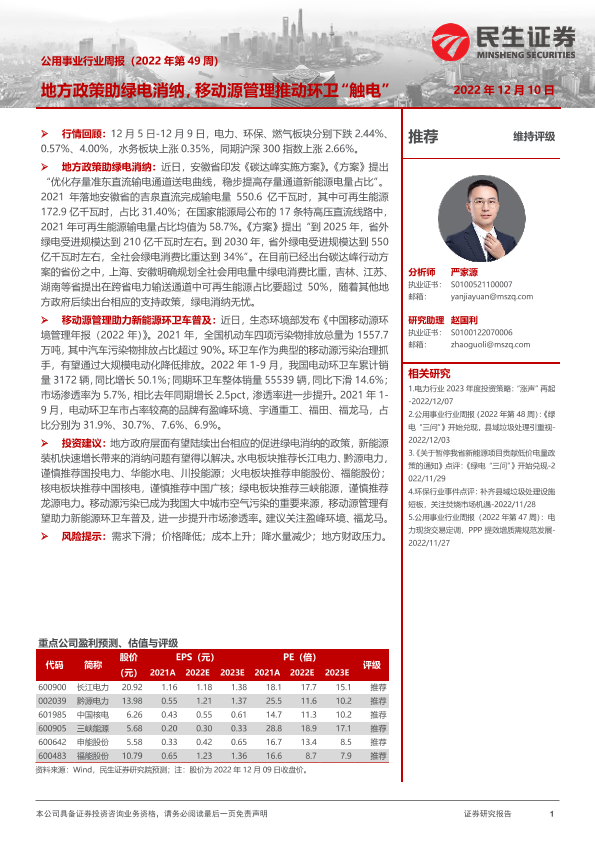 【民生证券】【20221210】公用事业行业周报:地方政策助绿电消纳,移动源管理推动环卫“触电”-26页