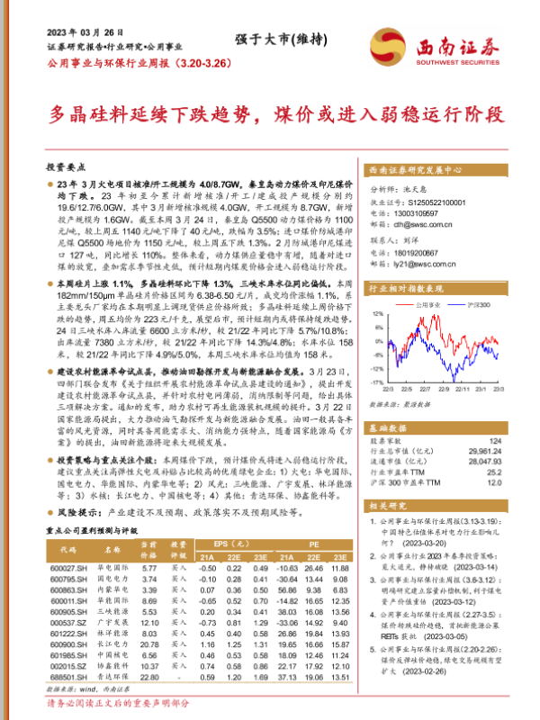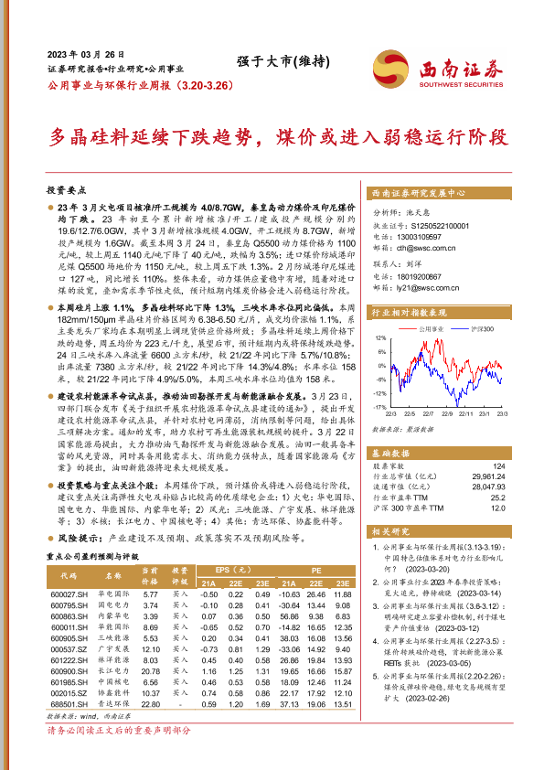 【西南证券】【20230326】公用事业与环保行业周报:多晶硅料延续下跌趋势,煤价或进入弱稳运行阶段-22页