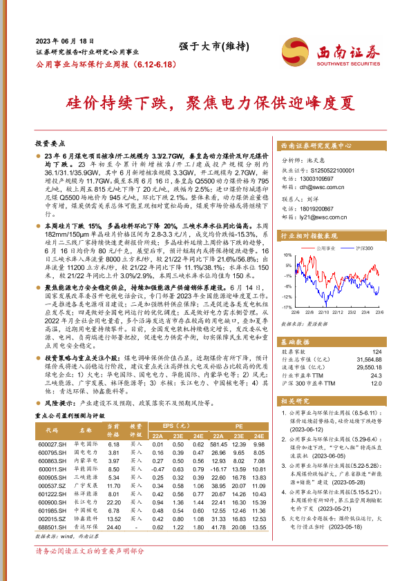 【西南证券】【20230618】公用事业与环保行业周报:硅价持续下跌,聚焦电力保供迎峰度夏-20页