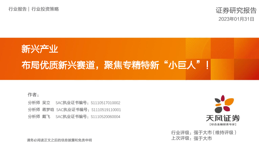 【天风证券】【20230131】新兴产业:布局优质新兴赛道,聚焦专精特新“小巨人”-65页