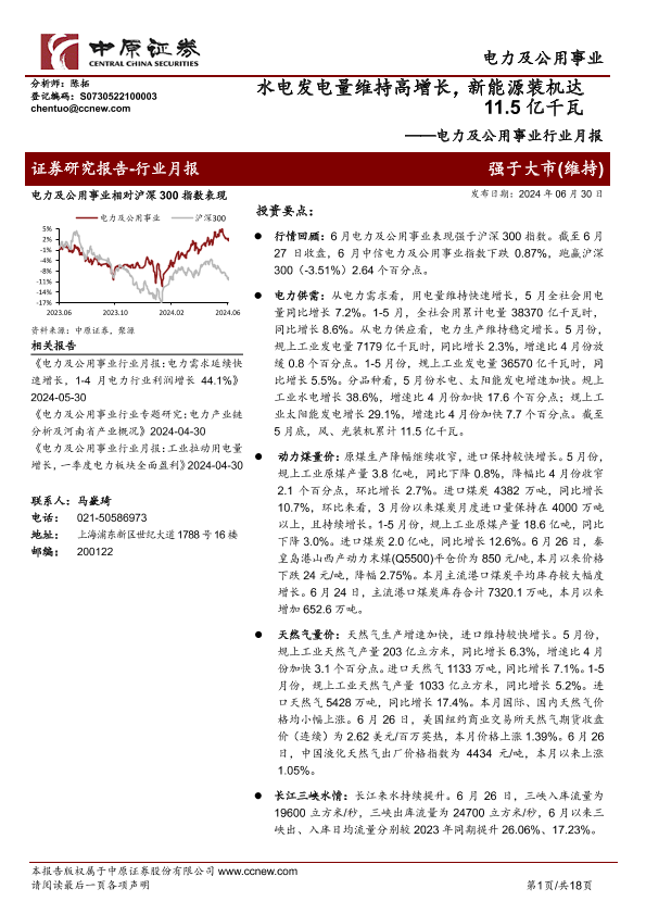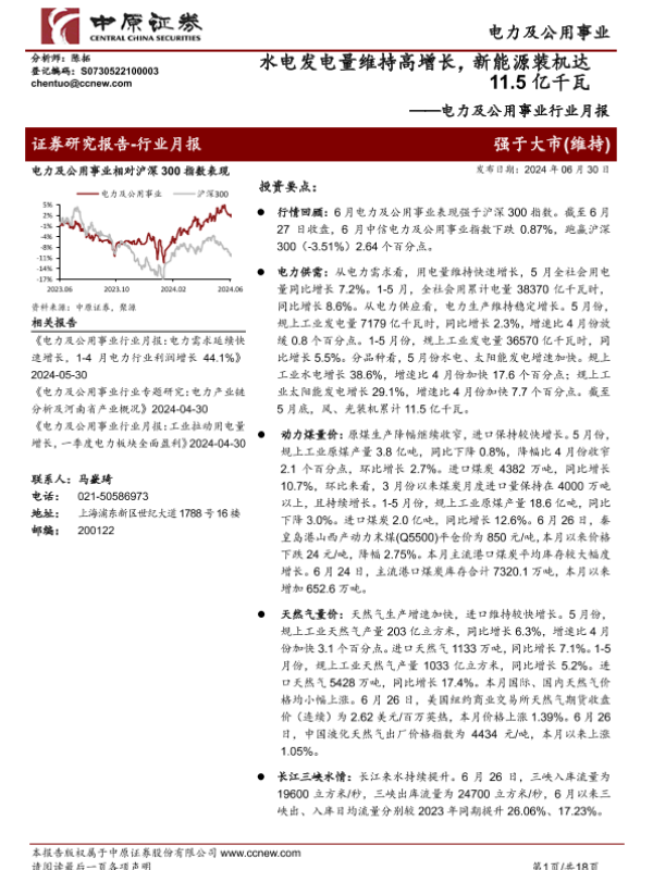 【中原证券】【20240630】电力及公用事业行业月报:水电发电量维持高增长,新能源装机达11.5亿千瓦-18页