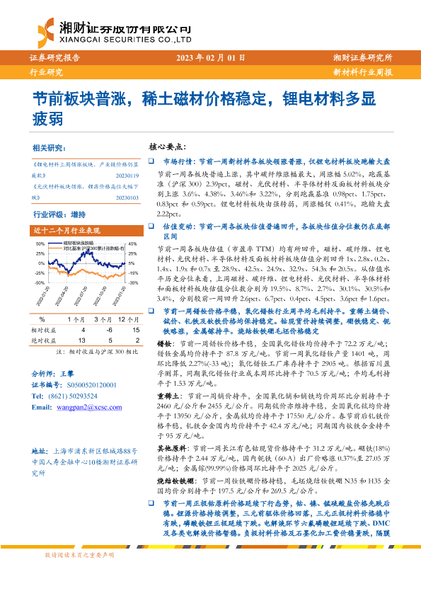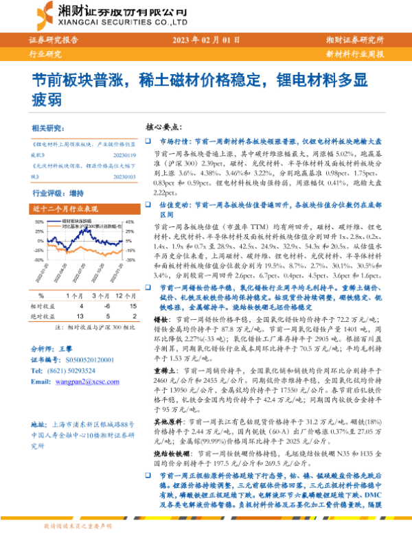【湘财证券】【20230201】新材料行业周报:节前板块普涨,稀土磁材价格稳定,锂电材料多显疲弱-15页