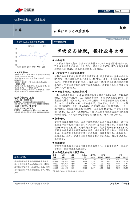 【国信证券】【20200808】证券行业8月投资策略:市场交易活跃,投行业务大增-8页