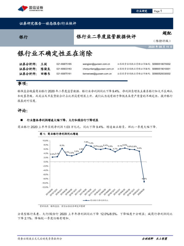 【国信证券】【20200811】银行业二季度监管数据快评:银行业不确定性正在消除-9页