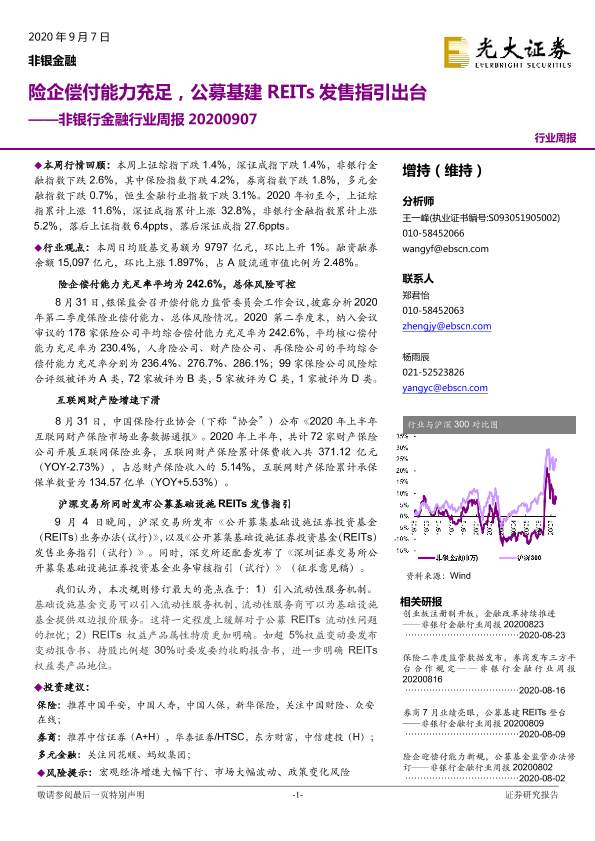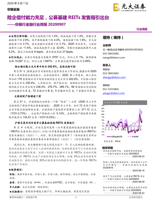 【光大证券】【20200907】非银行金融行业周报:险企偿付能力充足,公募基建REITs发售指引出台-14页