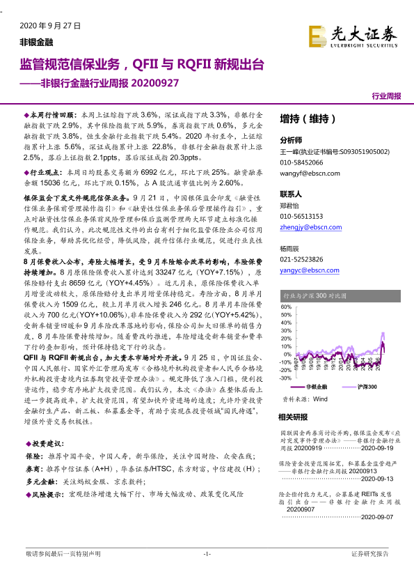 【光大证券】【20200927】非银行金融行业周报:监管规范信保业务,QFII与RQFII新规出台-14页