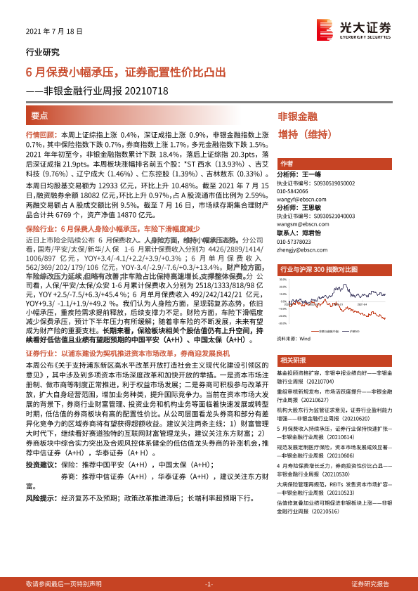 【光大证券】【20210718】非银金融行业周报:6月保费小幅承压,证券配置性价比凸出-10页