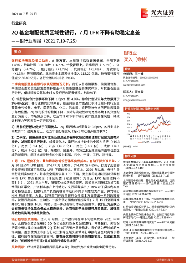 【光大证券】【20210725】2Q基金增配优质区域性银行,7月LPR不降有助稳定息差-14页