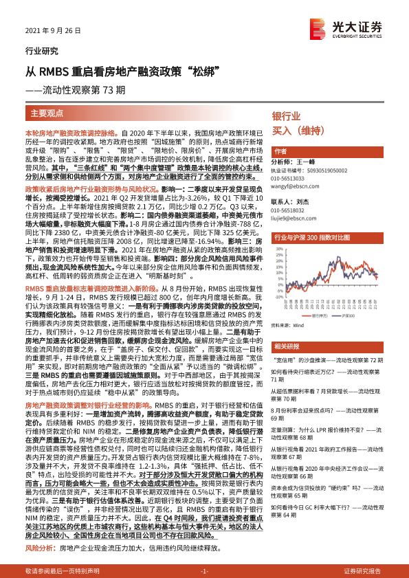 银行业流动性 政策调控 RMBS 房地产市场 房地产融资