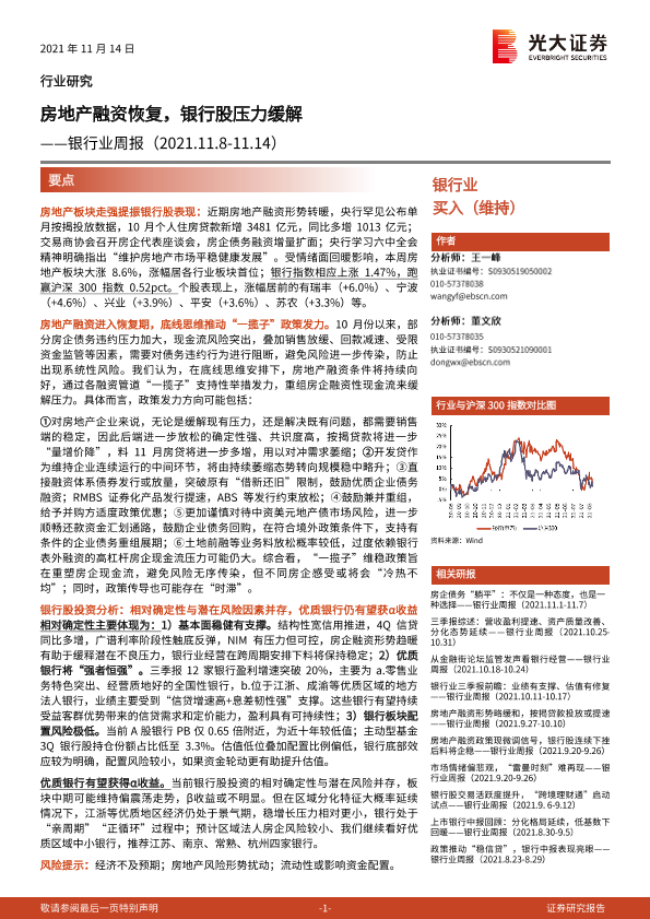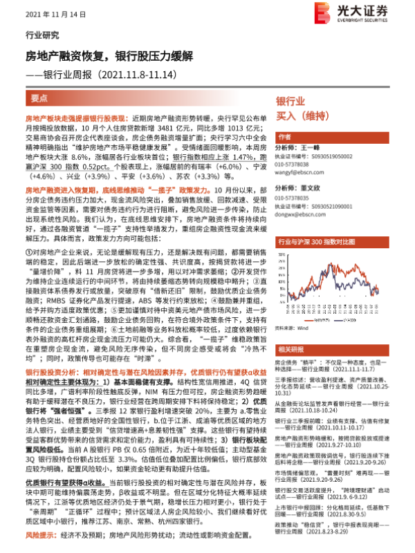 【光大证券】【20211114】银行业周报:房地产融资恢复,银行股压力缓解-12页