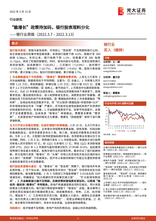 【光大证券】【20220313】银行业周报:“稳增长”政策待加码,银行股表现料分化-10页