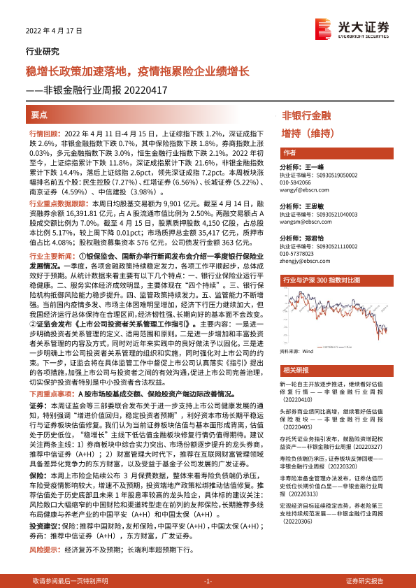 【光大证券】【20220417】非银金融行业周报:稳增长政策加速落地,疫情拖累险企业绩增长-8页