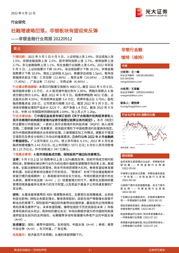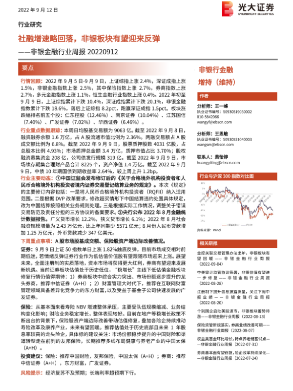 【光大证券】【20220912】非银金融行业周报:社融增速略回落,非银板块有望迎来反弹-7页