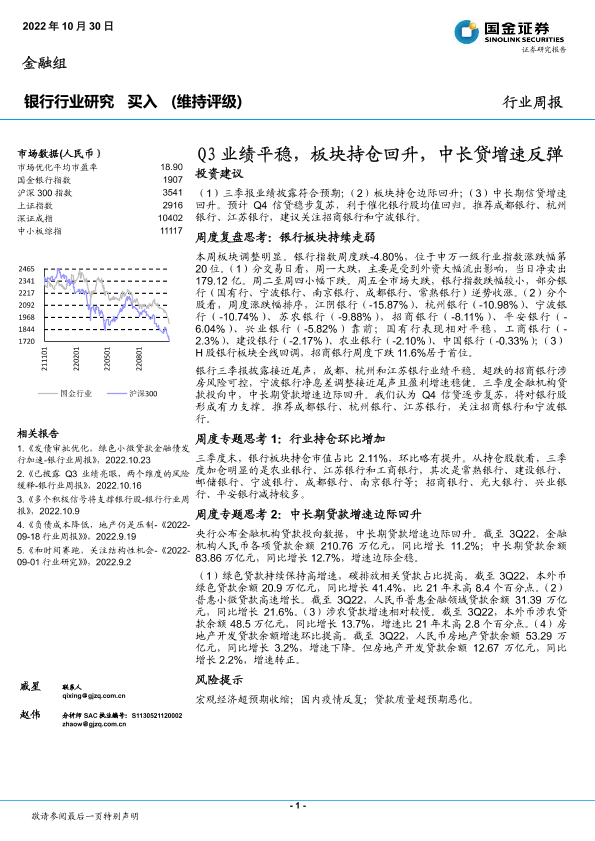 【国金证券】【20221030】Q3业绩平稳,板块持仓回升,中长贷增速反弹-10页