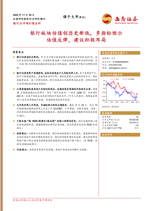 【西南证券】【20221125】银行业市场行情点评:银行板块估值创历史新低,多指标预示估值反弹,建议积极布局-13页