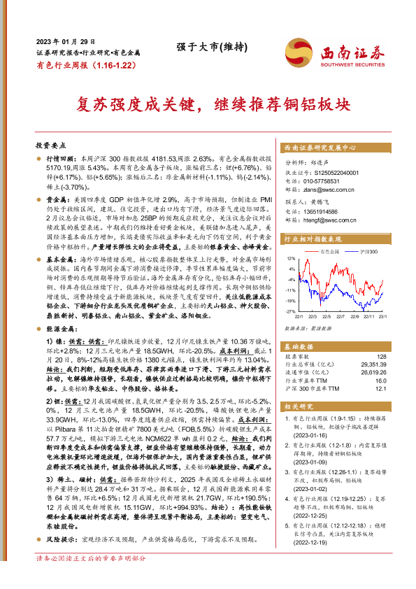 【西南证券】【20230129】有色行业周报:复苏强度成关键,继续推荐铜铝板块-26页