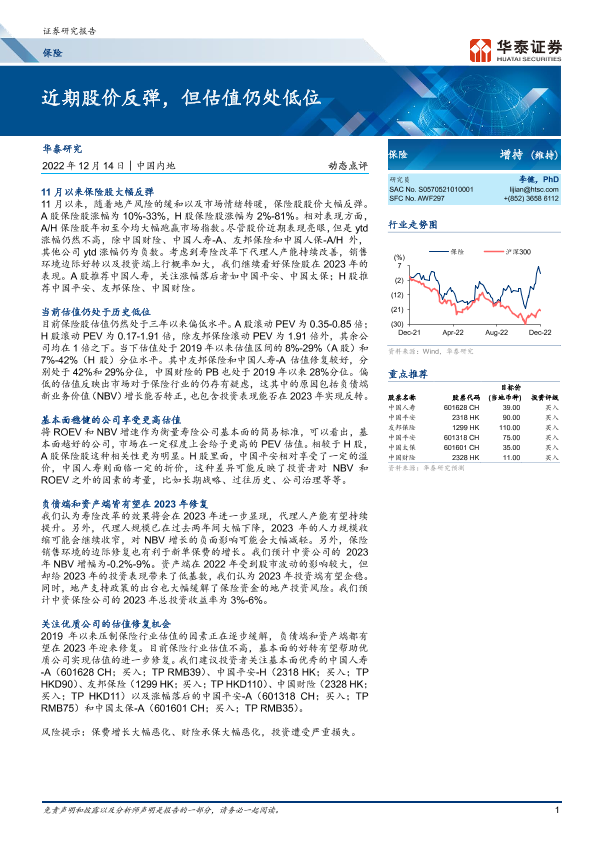 【华泰证券】【20221214】保险动态点评:近期股价反弹,但估值仍处低位-11页
