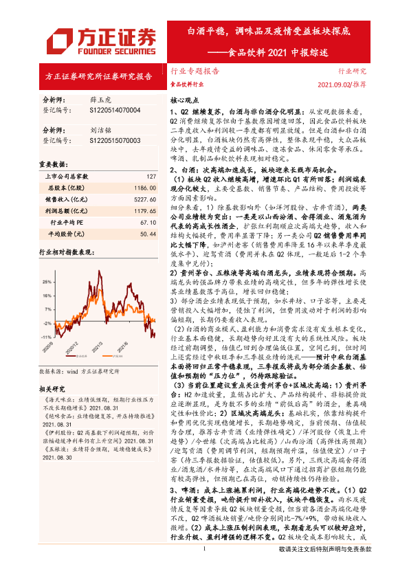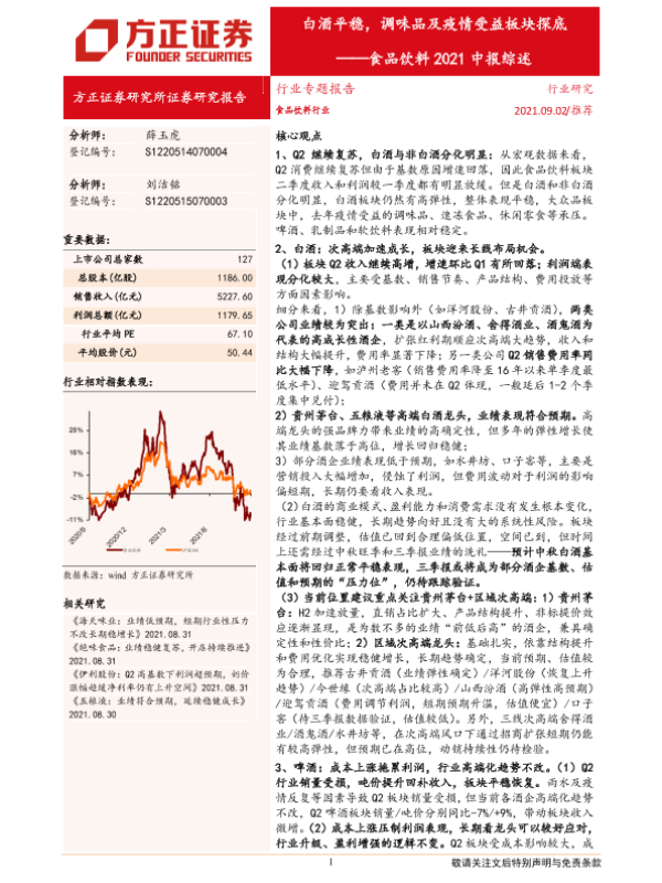 【方正证券】【20210902】食品饮料行业2021中报综述:白酒平稳,调味品及疫情受益板块探底-32页