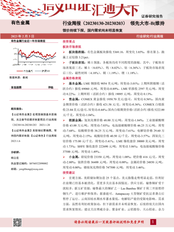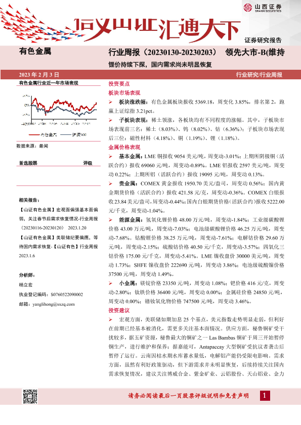 【山西证券】【20230203】有色金属行业周报:锂价持续下探,国内需求尚未明显恢复-20页