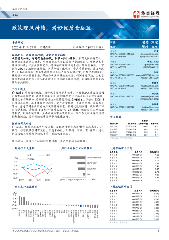 【华泰证券】【20231105】金融行业周报(第四十四周):政策暖风持续,看好优质金融股-35页