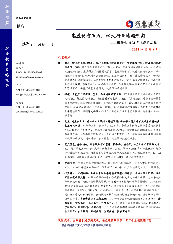 【兴业证券】【20241106】息差仍有压力,四大行业绩超预期-28页