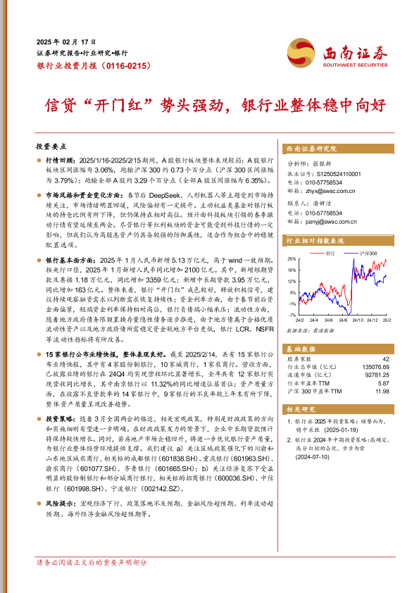 【西南证券】【20250217】银行业投资月报:信贷“开门红”势头强劲,银行业整体稳中向好-28页