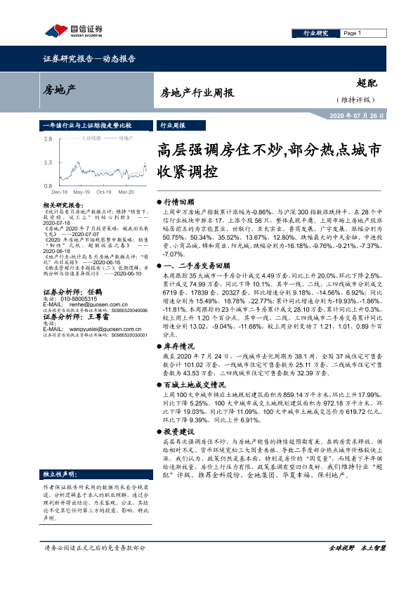 【国信证券】【20200726】房地产行业周报:高层强调房住不炒,部分热点城市收紧调控-15页