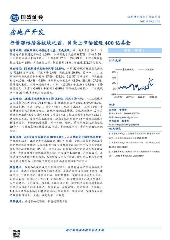 【国盛证券】【20200817】房地产开发行业周报:行情涨幅居各板块之首,贝壳上市估值近400亿美金-19页