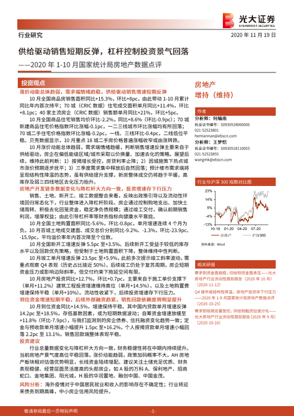 【光大证券】【20201119】2020年1-10月国家统计局房地产数据点评:供给驱动销售短期反弹,杠杆控制投资景气回落-13页