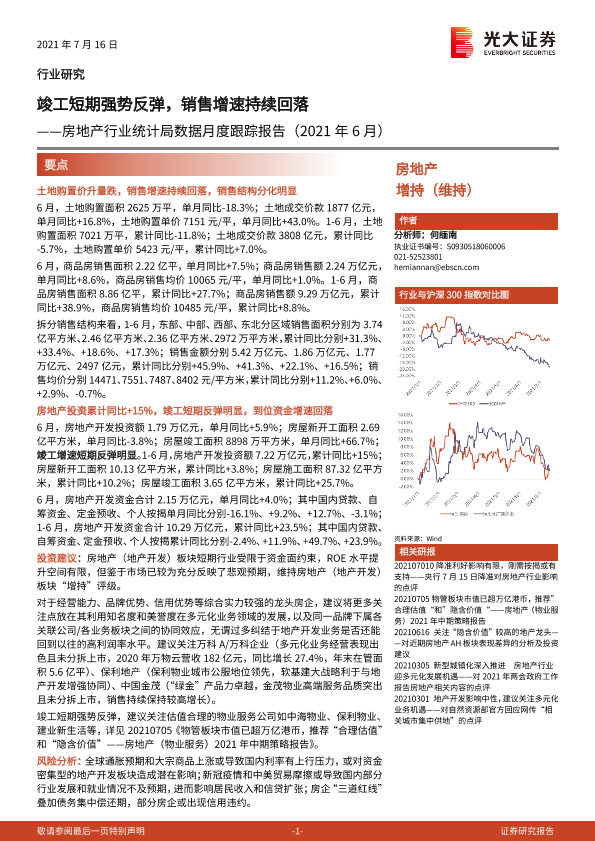 【光大证券】【20210716】房地产行业统计局数据月度跟踪报告:竣工短期强势反弹,销售增速持续回落-11页
